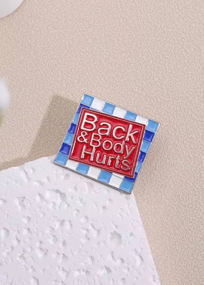 A cheeky twist on a familiar favorite — this “Back and Body Hurts” badge is for everyone powered by caffeine, complaints, and cute accessories. Pin it on your tote, jacket, or mood. Because adulthood hurts, but at least you look cute doing it 💖